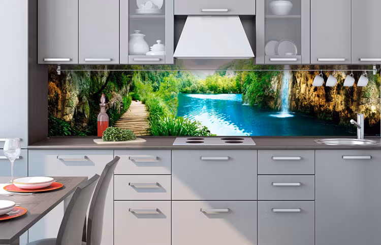 Självhäftande laminerad vattentålig folie som stänkskydd för köket. Enkel att  sätta upp och hålla ren. Flera storlekar. LEVERANSTID CA 5 - 10 DAGAR.